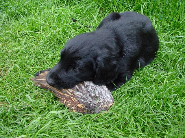 Kim und Twister üben schon einmal mit einem Fasanenflügel für ihr künftiges Jagdtraining ganz nach dem Motto: "Früh übt sich wer ein Meister sein will."