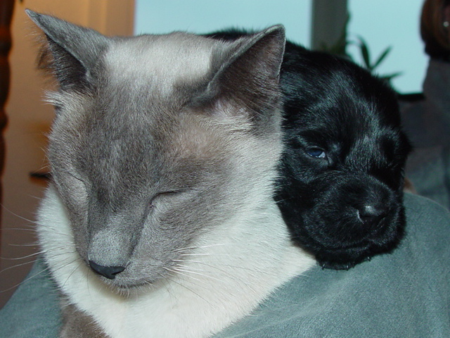 Ein weiterer Hausbewohner ist noch nicht vorgestellt worden. Das liegt daran, dass Murphy, der Kater, nur selten im Haus zu begrüssen ist. Nur wenn es einen Wurf hat, schränkt er sich in seinen Revierausflügen ein. ... und prompt hat er sich mit dem einzigen Mädel der Dreierbande angefreundet.