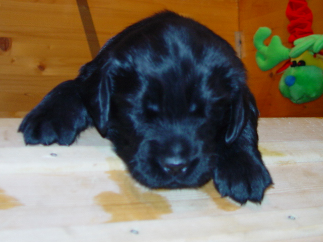 Jetzt wo die Augen offen sind und die Fortbewegung sich immer einfacher gestaltet, fällt Indy's Blick auf Isheena, die sich nur zu gerne von ihm schmusen lässt. Isheena's "Kraul mir die Brust"-Rückenlage begleitet einen Flati sein ganzes Leben lang.