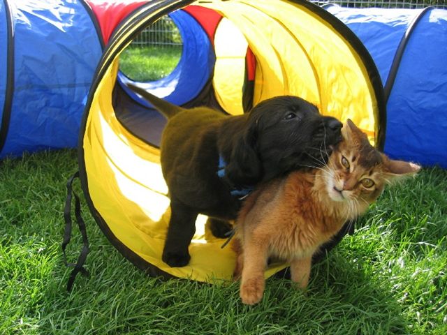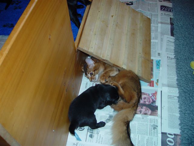 Eine neue Mitbewohnerin hat es in die Wurfkiste verschlagen und sie wird sofort vom Türsteher auf Herz und Nieren überprüft. Lucy, eine Somalikätzin, ist selber noch ein halber Welpe.