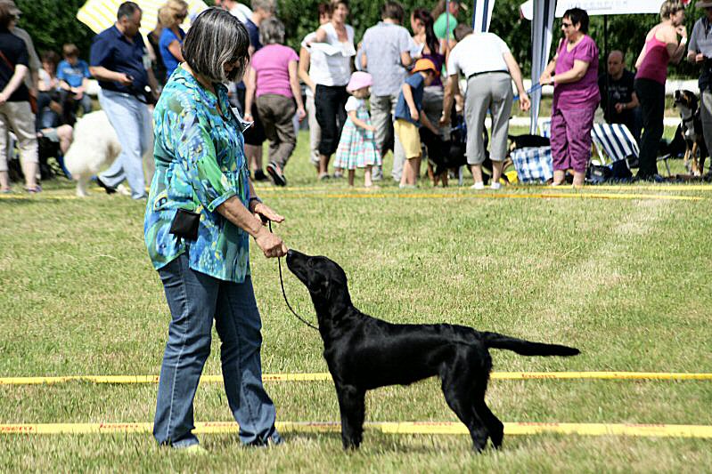 "a confident 5 mth old baby, good bone, nicely balanced, excellent top line, well set tail, strong hind quarters, has a pleasing head, moved with confidence and style"