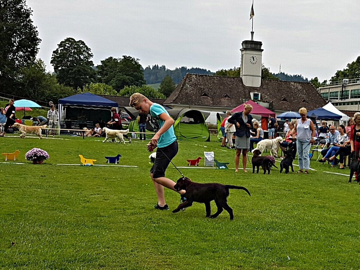 Jerome und Ruby geben beide ihr Bestes bei ihrer ersten Hunde-Ausstellung hier in Burgdorf.