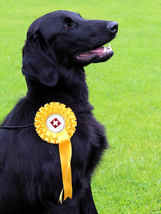 "nicely balanced puppy, feminin head, could have a bit longer muzzle, a bit long, under jaw slightly overshot at the moment, very good neck and shoulder, exc. body, deep rib cage, strong bones, well angulated behind, moves with drive, a bit close behind at the moment, well handled, nice temperament"