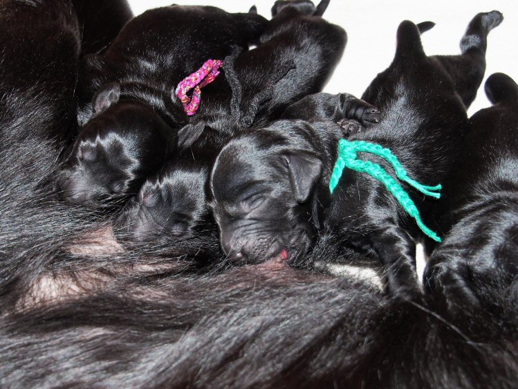 Am Nachmittag des 28. April 2016 hat Angel 10 Welpen zur Welt gebracht. Die ersten 8 kamen innerhalb von 1 1/2 Stunden - da blieb kaum Zeit für's Protokoll und zum Wiegen! Dann legte sie eine Ruhepause von einer Stunde ein und der Letzte kam dann nach einer weiteren kurzen Pause. Es sind 7 Rüden und 3 Hündinnen.