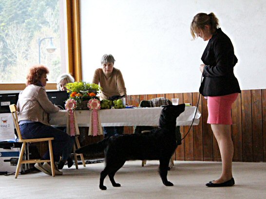 Sehr hübsche Hündin von vorzüglichem Typ, femininer Kopf mit sehr gutem Ausdruck, trockener Hals, sehr gute obere Linie, schräge Schulter, Oberarm eine Idee steil, sehr gute Brusttiefe, vorzügliche Nachhandwinkelung, Pfoten etwas flach. In der Bewegung zeigt sie sich manierlich und mit gutem Schwung.