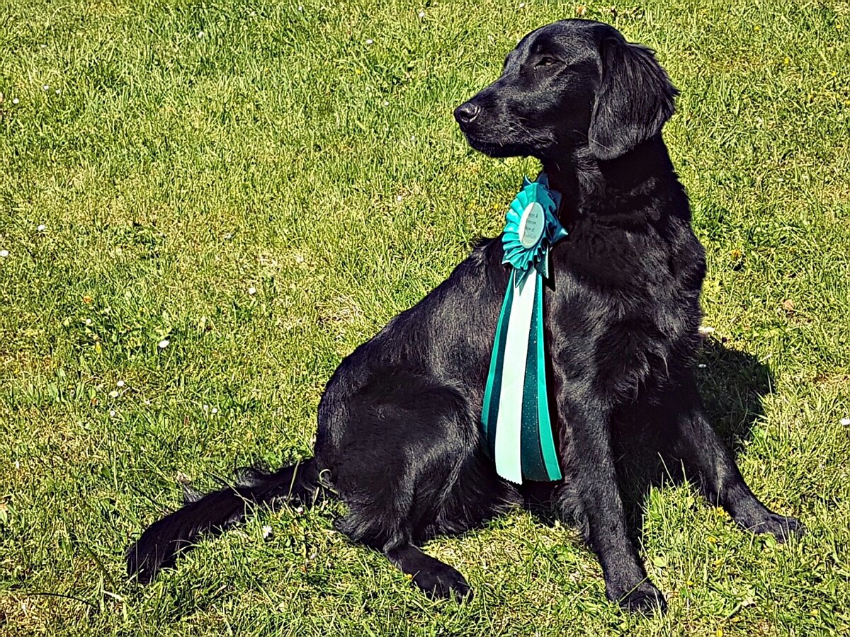"12 Monate alte, harmonisch gebaute, schwarze Hündin, vorz. Kopf mit intelligentem Ausdruck, vorz. Hals, Vorderhand Winkelung etwas steil, Hinterhand Winkelung korrekt, feste obere Linie mit kurzer, kräftiger Lende, vorz. Haarkleid, fliessende Bewegung, sehr freundliches Wesen, hervorragend präsentiert" - V2