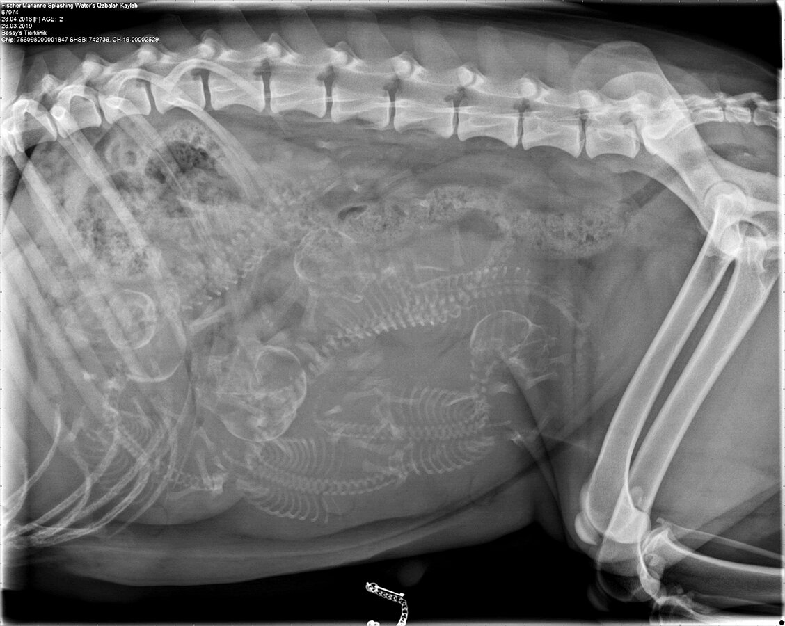 Auf dem Röntgenbild konnten wir klar 6 kleine Skelette zählen. Nun heisst es noch knapp eine Woche Geduld haben, bis die Welpen da sind!